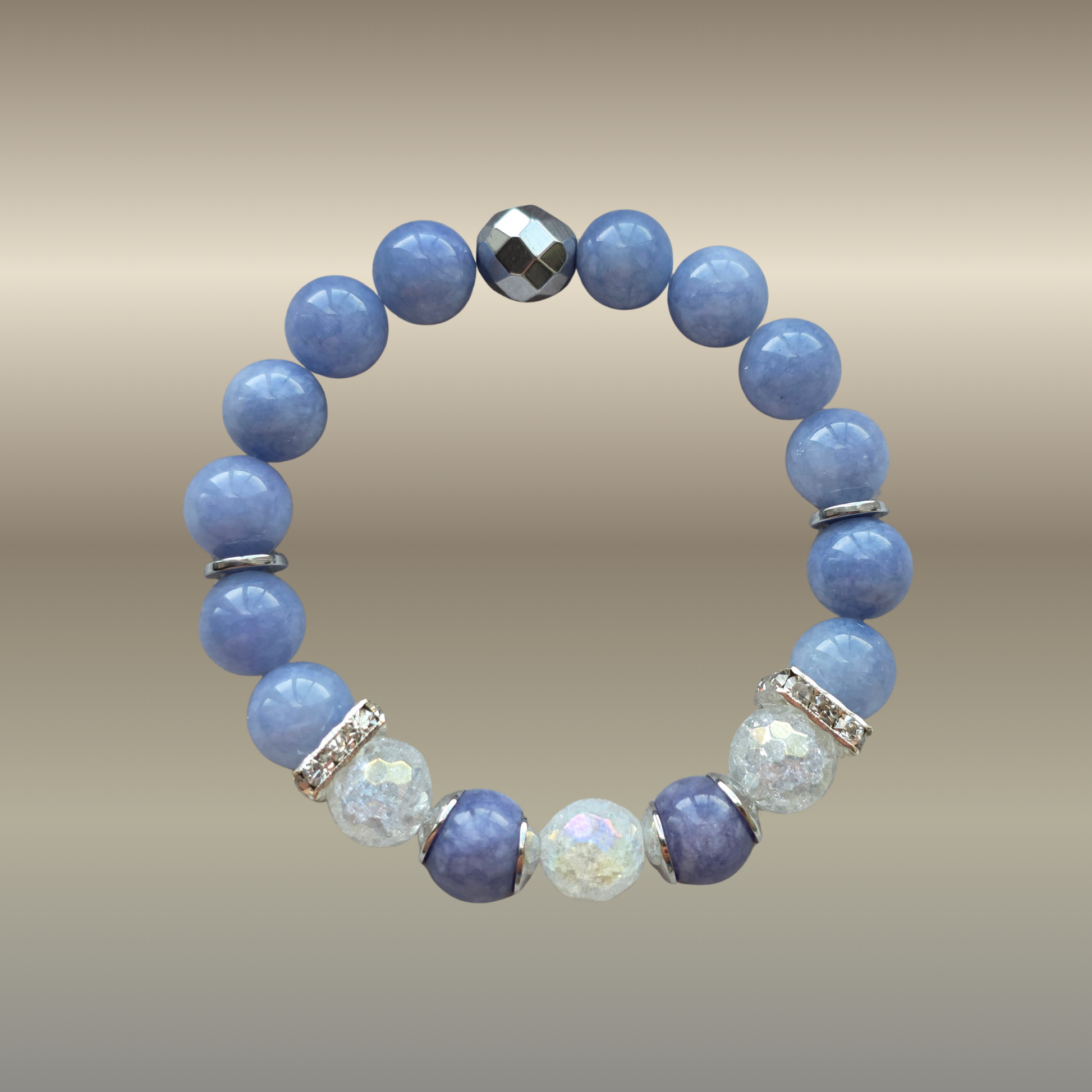Angelitas yra pagrindinis šios apyrankės akmuo. Jis siejamas su ramybe, švelnumu ir vidiniu saugumo jausmu. Padeda sumažinti įtampą, nerimą, vidinį spaudimą. Tai akmuo, kuris tarsi „apgaubia“ ir leidžia atsipalaiduoti.