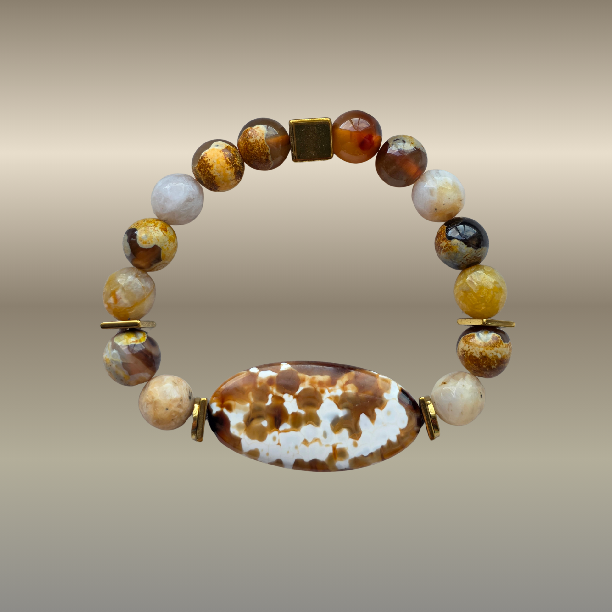 Leopardinis agatas yra stiprios, autentiškos saviraiškos akmuo. Jis padeda išlaisvinti savo tikrąją prigimtį, drąsiau rodyti save pasauliui ir nebijoti būti kitokiu. Tai akmuo, kuris stiprina pasitikėjimą savimi ir leidžia lengviau priimti savo daugialypiškumą.